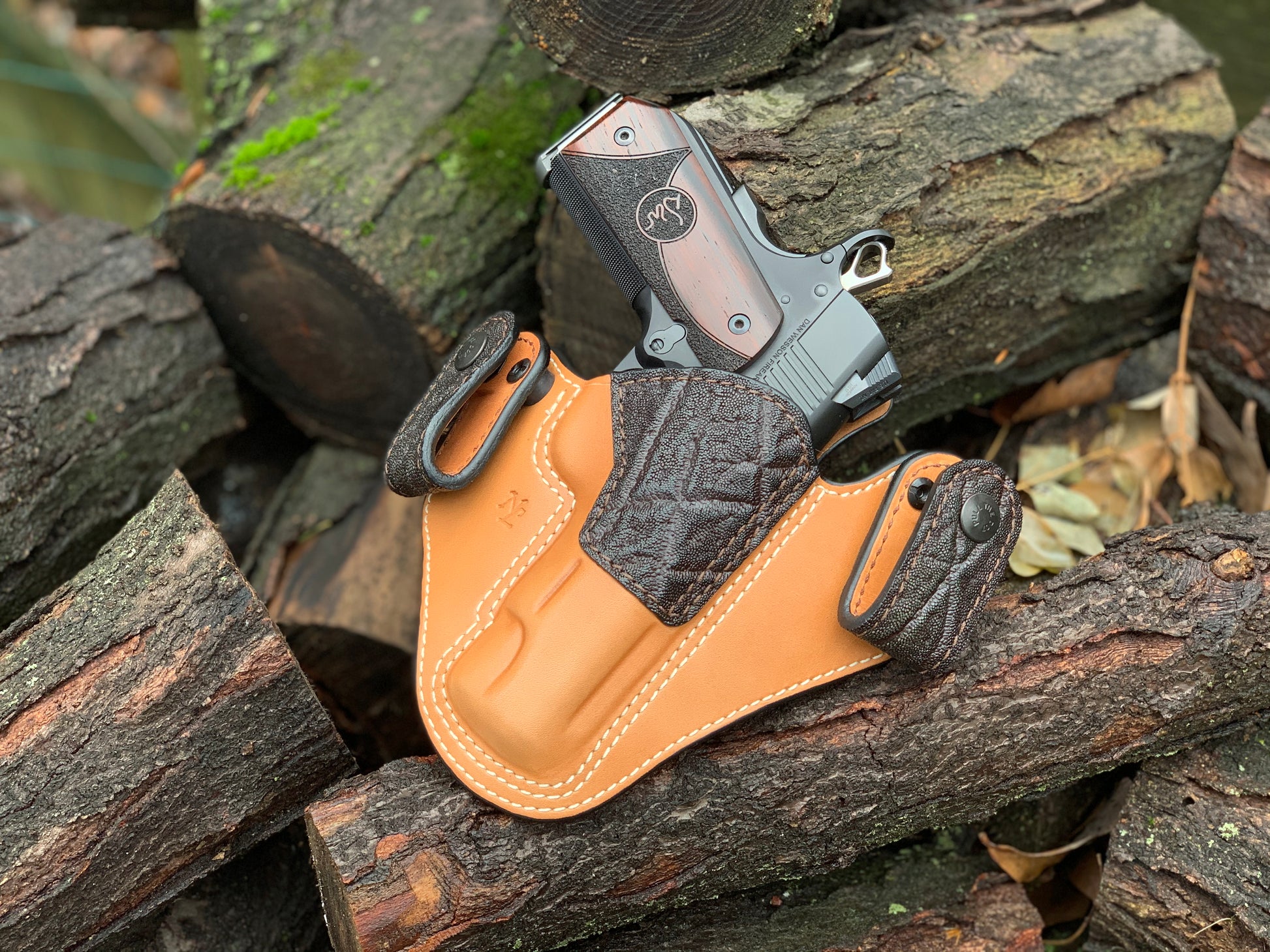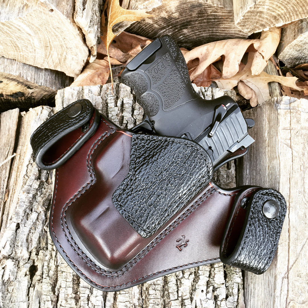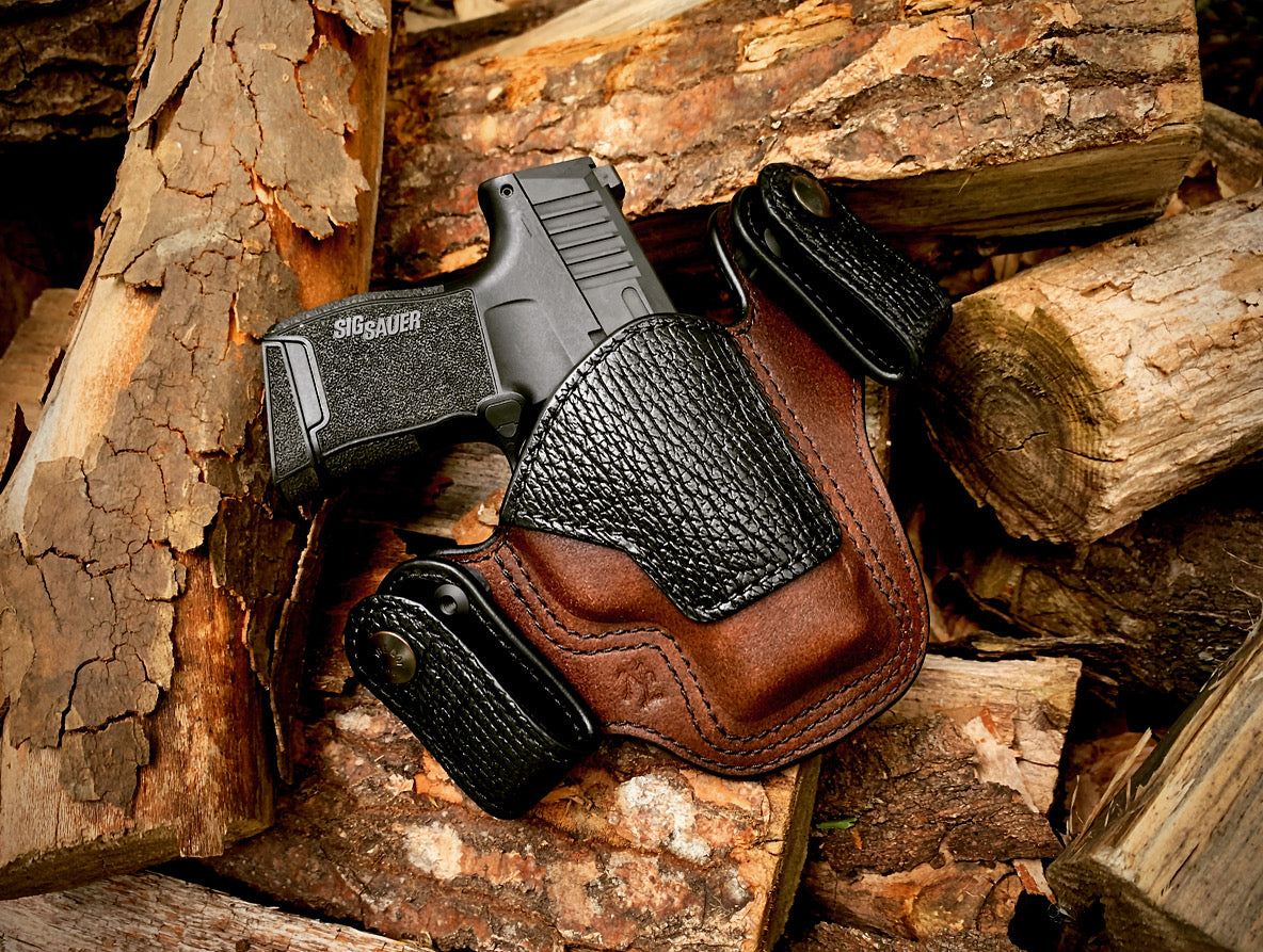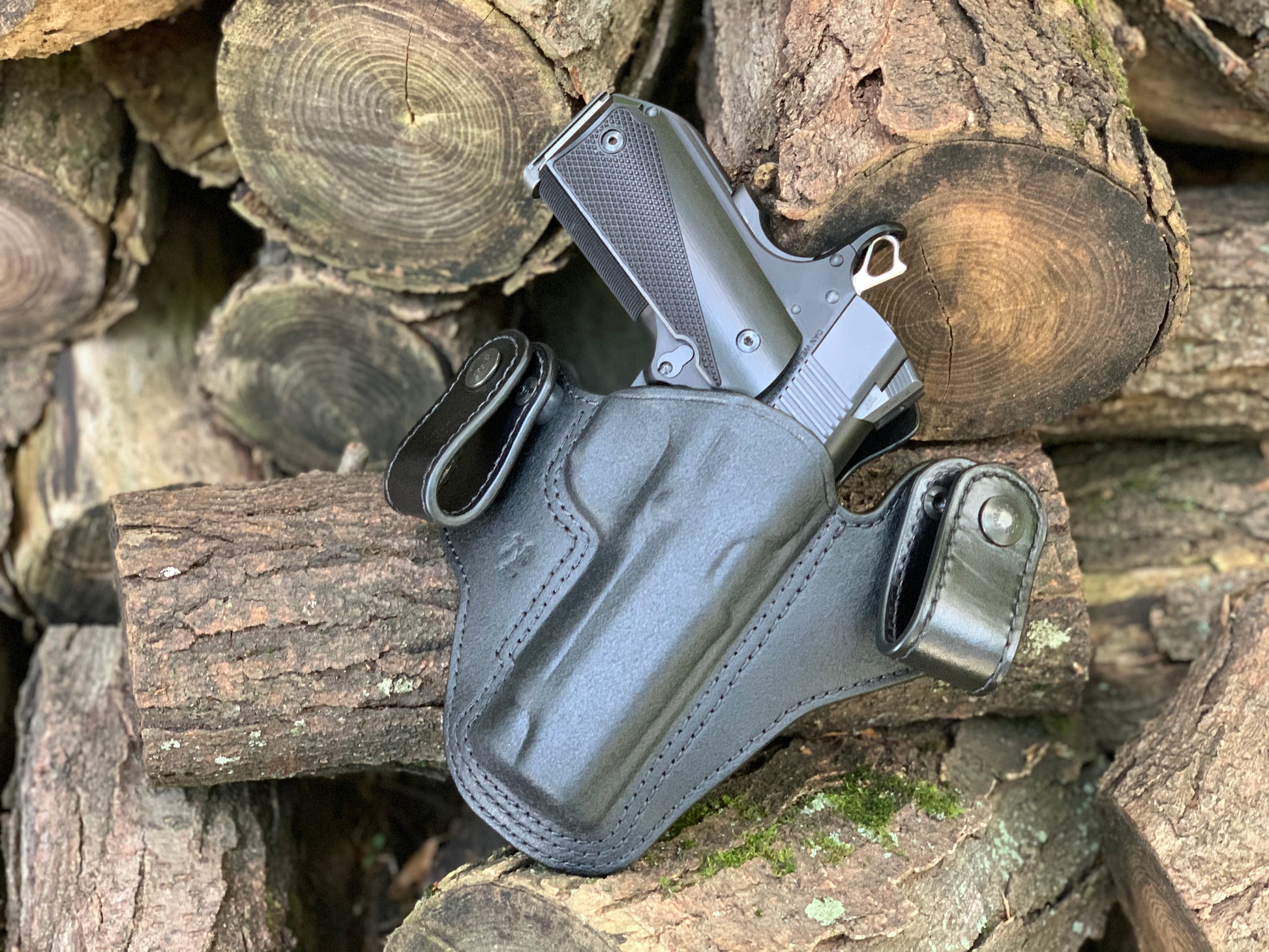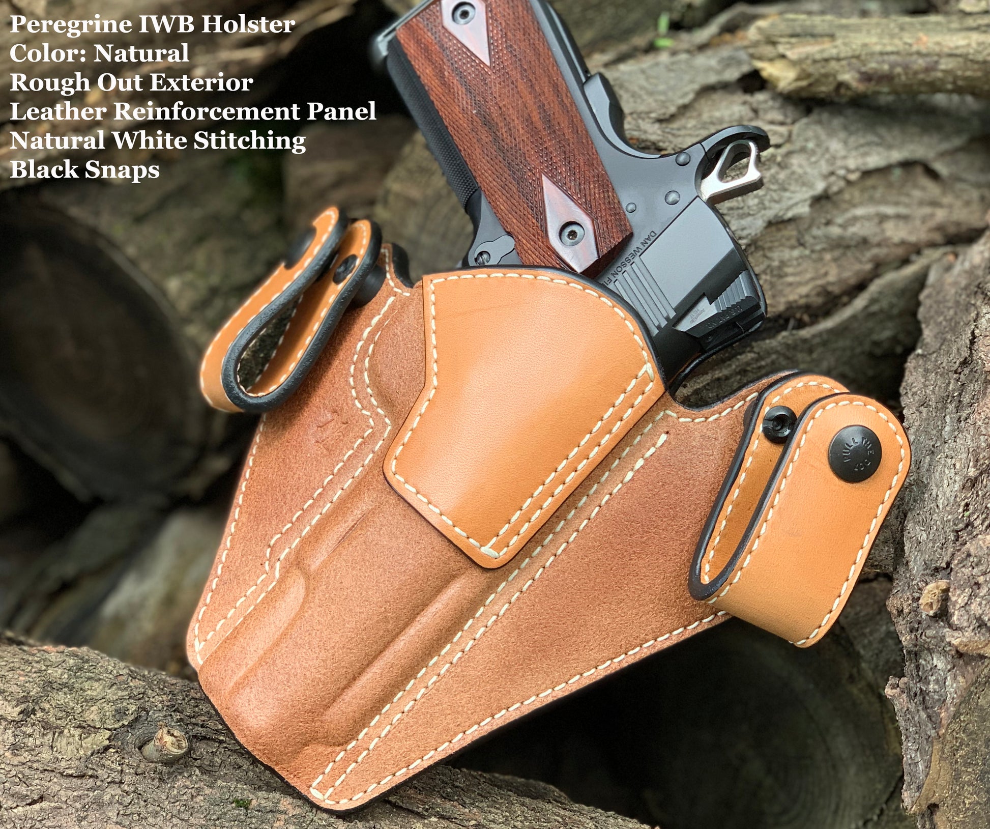 The Peregrine IWB holster is engineered with a 25º forward rake and wide belt loop spacing to securely draw the handgun grip to the hip for maximum concealment. "Pull the dot" snaps enable easy detachment of the holster from the belt. The holster rides low on the hip while allowing for a complete combat grip. Sweat/body shield comes standard with the Peregrine. Optional leather reinforcement piece is available by request.